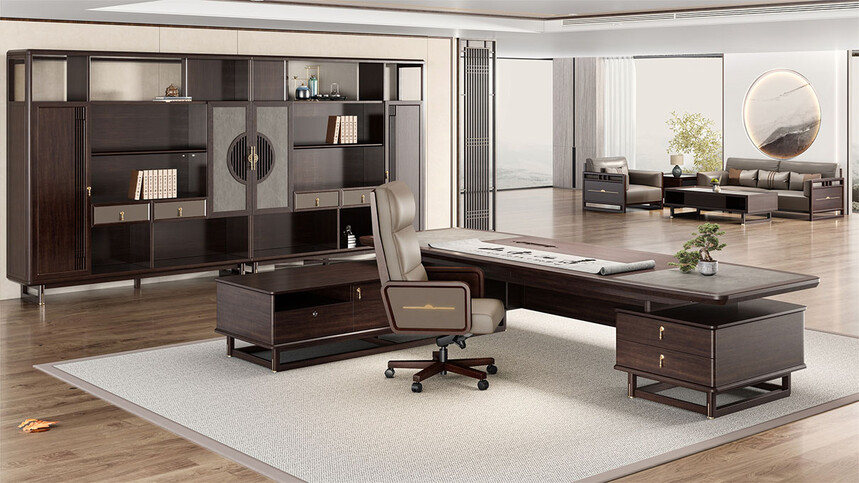 鸿泰系列是一款新中式风格的办公家具,设计灵感源于中式传统装饰纹样“回”字形,因其形式回环反复,延绵不断,在民间有“富贵不断头”的说法,有连绵不断、吉利长久的吉祥寓意,在造型上主要采用硬朗简洁的直线条,温润的乌金木与质朴的岩板相结合,刚柔并济,时尚大方,既使得中式家具古典、质朴的内涵显现,又符合现代办公追求的时尚感、实用性。